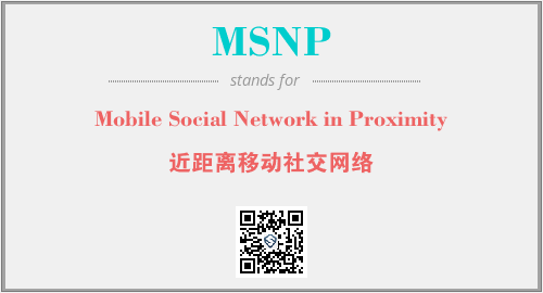 上述内容是“Mobile Social Network in Proximity”作为“MSNP”的缩写,解释为“近距离移动社交网络”时的信息,以及英文缩略词MSNP所代表的英文单词,其对应的中文拼音、详细解释以及在英文中的流行度和相关分类、应用领域及应用示例等。