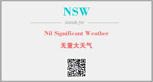 上述内容是“Nil Significant Weather”作为“NSW”的缩写,解释为“无重大天气”时的信息,以及英文缩略词NSW所代表的英文单词,其对应的中文拼音、详细解释以及在英文中的流行度和相关分类、应用领域及应用示例等。