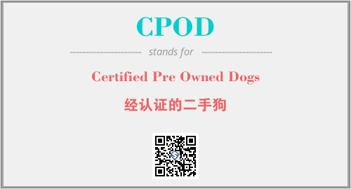 英文缩略词“CPOD”经常作为“Certified Pre Owned Dogs”的英文缩写来使用,中文表示:“经认证的二手狗”。本文将详细介绍英文缩写词CPOD所代表英文单词,其对应的中文拼音、详细解释以及在英语中的流行度。此外,还有关于缩略词CPOD的分类、应用领域及相关应用示例等。