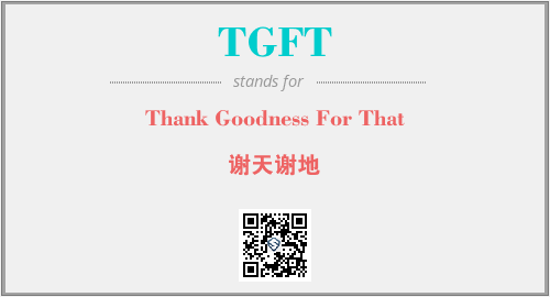 上述内容是“Thank Goodness For That”作为“TGFT”的缩写,解释为“谢天谢地”时的信息,以及英文缩略词TGFT所代表的英文单词,其对应的中文拼音、详细解释以及在英文中的流行度和相关分类、应用领域及应用示例等。