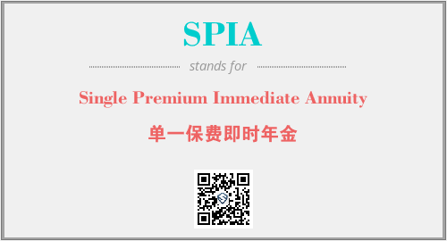 英文缩略词“SPIA”经常作为“Single Premium Immediate Annuity”的英文缩写来使用,中文表示:“单一保费即时年金”。本文将详细介绍英文缩写词SPIA所代表英文单词,其对应的中文拼音、详细解释以及在英语中的流行度。此外,还有关于缩略词SPIA的分类、应用领域及相关应用示例等。