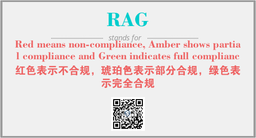 上述内容是“Red means non-compliance, Amber shows partial compliance and Green indicates full compliance”作为“RAG”的缩写,解释为“红色表示不合规,琥珀色表示部分合规,绿色表示完全合规”时的信息,以及英文缩略词RAG所代表的英文单词,其对应的中文拼音、详细解释以及在英文中的流行度和相关分类、应用领域及应用示例等。