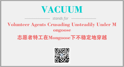 上述内容是“Volunteer Agents Crusading Unsteadily Under Mongoose”作为“VACUUM”的缩写,解释为“志愿者特工在Mongoose下不稳定地穿越”时的信息,以及英文缩略词VACUUM所代表的英文单词,其对应的中文拼音、详细解释以及在英文中的流行度和相关分类、应用领域及应用示例等。