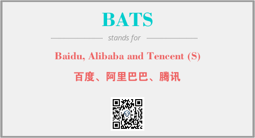 上述内容是“Baidu, Alibaba and Tencent (S)”作为“BATS”的缩写,解释为“百度、阿里巴巴、腾讯”时的信息,以及英文缩略词BATS所代表的英文单词,其对应的中文拼音、详细解释以及在英文中的流行度和相关分类、应用领域及应用示例等。