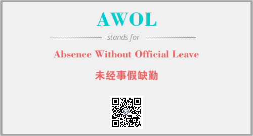 上述内容是“Absence Without Official Leave”作为“AWOL”的缩写,解释为“未经事假缺勤”时的信息,以及英文缩略词AWOL所代表的英文单词,其对应的中文拼音、详细解释以及在英文中的流行度和相关分类、应用领域及应用示例等。