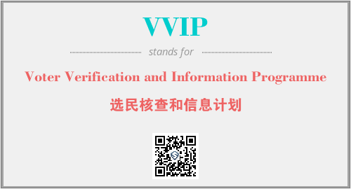 上述内容是“Voter Verification and Information Programme”作为“VVIP”的缩写,解释为“选民核查和信息计划”时的信息,以及英文缩略词VVIP所代表的英文单词,其对应的中文拼音、详细解释以及在英文中的流行度和相关分类、应用领域及应用示例等。