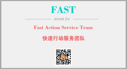 英文缩略词“FAST”经常作为“Fast Action Service Team”的英文缩写来使用,中文表示:“快速行动服务团队”。本文将详细介绍英文缩写词FAST所代表英文单词,其对应的中文拼音、详细解释以及在英语中的流行度。此外,还有关于缩略词FAST的分类、应用领域及相关应用示例等。