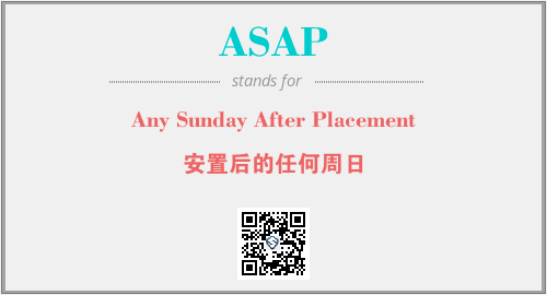 上述内容是“Any Sunday After Placement”作为“ASAP”的缩写,解释为“安置后的任何周日”时的信息,以及英文缩略词ASAP所代表的英文单词,其对应的中文拼音、详细解释以及在英文中的流行度和相关分类、应用领域及应用示例等。