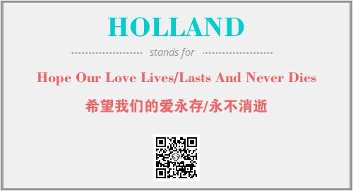 上述内容是“Hope Our Love Lives/Lasts And Never Dies”作为“HOLLAND”的缩写,解释为“希望我们的爱永存/永不消逝”时的信息,以及英文缩略词HOLLAND所代表的英文单词,其对应的中文拼音、详细解释以及在英文中的流行度和相关分类、应用领域及应用示例等。