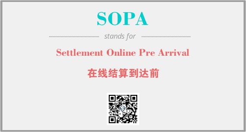 英文缩略词“SOPA”经常作为“Settlement Online Pre Arrival”的英文缩写来使用,中文表示:“在线结算到达前”。本文将详细介绍英文缩写词SOPA所代表英文单词,其对应的中文拼音、详细解释以及在英语中的流行度。此外,还有关于缩略词SOPA的分类、应用领域及相关应用示例等。