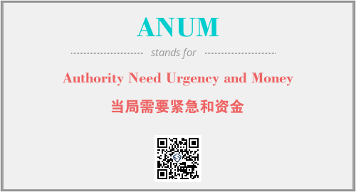 上述内容是“Authority Need Urgency and Money”作为“ANUM”的缩写,解释为“当局需要紧急和资金”时的信息,以及英文缩略词ANUM所代表的英文单词,其对应的中文拼音、详细解释以及在英文中的流行度和相关分类、应用领域及应用示例等。