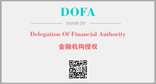 上述内容是“Delegation Of Financial Authority”作为“DOFA”的缩写,解释为“金融机构授权”时的信息,以及英文缩略词DOFA所代表的英文单词,其对应的中文拼音、详细解释以及在英文中的流行度和相关分类、应用领域及应用示例等。