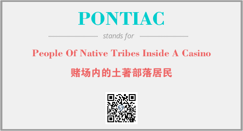 上述内容是“People Of Native Tribes Inside A Casino”作为“PONTIAC”的缩写,解释为“赌场内的土著部落居民”时的信息,以及英文缩略词PONTIAC所代表的英文单词,其对应的中文拼音、详细解释以及在英文中的流行度和相关分类、应用领域及应用示例等。