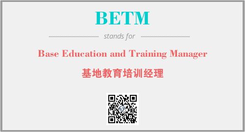 英文缩略词“BETM”经常作为“Base Education and Training Manager”的英文缩写来使用,中文表示:“基地教育培训经理”。本文将详细介绍英文缩写词BETM所代表英文单词,其对应的中文拼音、详细解释以及在英语中的流行度。此外,还有关于缩略词BETM的分类、应用领域及相关应用示例等。