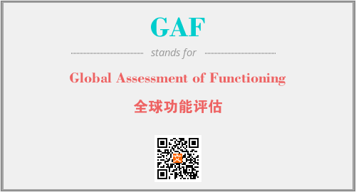 上述内容是“Global Assessment of Functioning”作为“GAF”的缩写,解释为“全球功能评估”时的信息,以及英文缩略词GAF所代表的英文单词,其对应的中文拼音、详细解释以及在英文中的流行度和相关分类、应用领域及应用示例等。