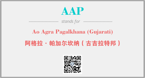 上述内容是“Ao Agra Pagalkhana (Gujarati)”作为“AAP”的缩写,解释为“阿格拉·帕加尔坎纳(古吉拉特邦)”时的信息,以及英文缩略词AAP所代表的英文单词,其对应的中文拼音、详细解释以及在英文中的流行度和相关分类、应用领域及应用示例等。
