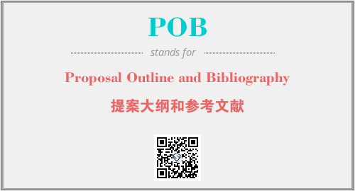 上述内容是“Proposal Outline and Bibliography”作为“POB”的缩写,解释为“提案大纲和参考文献”时的信息,以及英文缩略词POB所代表的英文单词,其对应的中文拼音、详细解释以及在英文中的流行度和相关分类、应用领域及应用示例等。