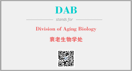 上述内容是“Division of Aging Biology”作为“DAB”的缩写,解释为“衰老生物学处”时的信息,以及英文缩略词DAB所代表的英文单词,其对应的中文拼音、详细解释以及在英文中的流行度和相关分类、应用领域及应用示例等。