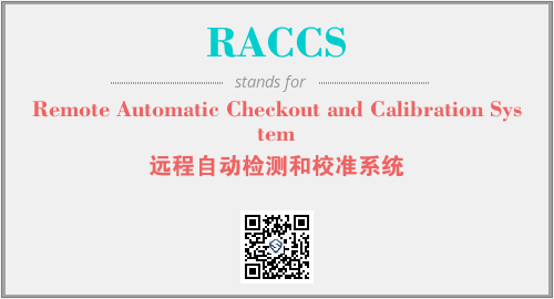英文缩略词“RACCS”经常作为“Remote Automatic Checkout and Calibration System”的英文缩写来使用,中文表示:“远程自动检测和校准系统”。本文将详细介绍英文缩写词RACCS所代表英文单词,其对应的中文拼音、详细解释以及在英语中的流行度。此外,还有关于缩略词RACCS的分类、应用领域及相关应用示例等。