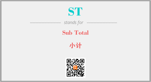 英文缩略词“ST”经常作为“Sub Total”的英文缩写来使用,中文表示:“小计”。本文将详细介绍英文缩写词ST所代表英文单词,其对应的中文拼音、详细解释以及在英语中的流行度。此外,还有关于缩略词ST的分类、应用领域及相关应用示例等。
