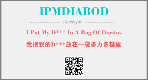 英文缩略词“IPMDIABOD”经常作为“I Put My D*** In A Bag Of Doritos”的英文缩写来使用,中文表示:“我把我的D***放在一袋多力多糖里”。本文将详细介绍英文缩写词IPMDIABOD所代表英文单词,其对应的中文拼音、详细解释以及在英语中的流行度。此外,还有关于缩略词IPMDIABOD的分类、应用领域及相关应用示例等。