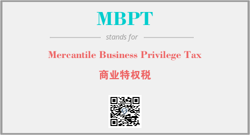 上述内容是“Mercantile Business Privilege Tax”作为“MBPT”的缩写,解释为“商业特权税”时的信息,以及英文缩略词MBPT所代表的英文单词,其对应的中文拼音、详细解释以及在英文中的流行度和相关分类、应用领域及应用示例等。