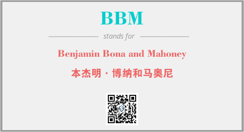 上述内容是“Benjamin Bona and Mahoney”作为“BBM”的缩写,解释为“本杰明·博纳和马奥尼”时的信息,以及英文缩略词BBM所代表的英文单词,其对应的中文拼音、详细解释以及在英文中的流行度和相关分类、应用领域及应用示例等。