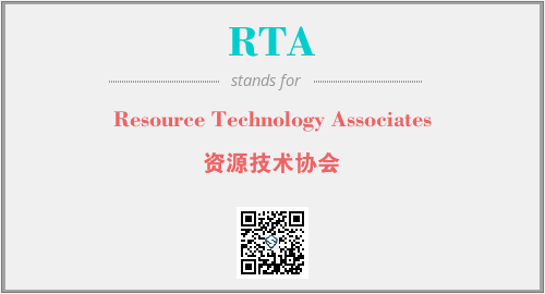 英文缩略词“RTA”经常作为“Resource Technology Associates”的英文缩写来使用,中文表示:“资源技术协会”。本文将详细介绍英文缩写词RTA所代表英文单词,其对应的中文拼音、详细解释以及在英语中的流行度。此外,还有关于缩略词RTA的分类、应用领域及相关应用示例等。