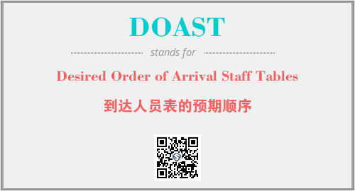 上述内容是“Desired Order of Arrival Staff Tables”作为“DOAST”的缩写,解释为“到达人员表的预期顺序”时的信息,以及英文缩略词DOAST所代表的英文单词,其对应的中文拼音、详细解释以及在英文中的流行度和相关分类、应用领域及应用示例等。