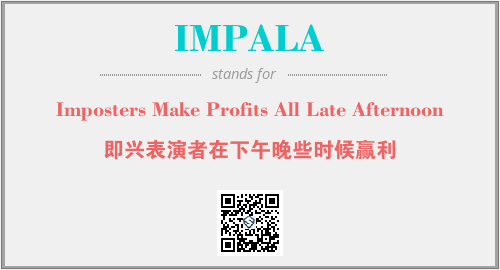 上述内容是“Imposters Make Profits All Late Afternoon”作为“IMPALA”的缩写,解释为“即兴表演者在下午晚些时候赢利”时的信息,以及英文缩略词IMPALA所代表的英文单词,其对应的中文拼音、详细解释以及在英文中的流行度和相关分类、应用领域及应用示例等。