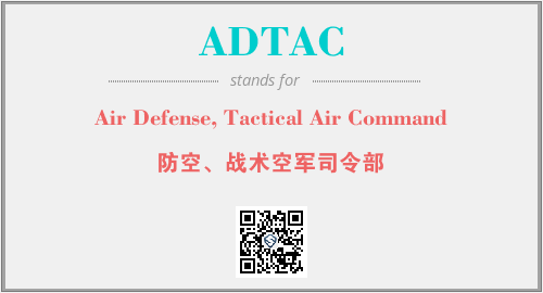 英文缩略词“ADTAC”经常作为“Air Defense, Tactical Air Command”的英文缩写来使用,中文表示:“防空、战术空军司令部”。本文将详细介绍英文缩写词ADTAC所代表英文单词,其对应的中文拼音、详细解释以及在英语中的流行度。此外,还有关于缩略词ADTAC的分类、应用领域及相关应用示例等。