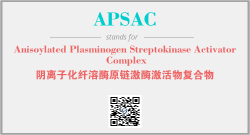 上述内容是“Anisoylated Plasminogen Streptokinase Activator Complex”作为“APSAC”的缩写,解释为“阴离子化纤溶酶原链激酶激活物复合物”时的信息,以及英文缩略词APSAC所代表的英文单词,其对应的中文拼音、详细解释以及在英文中的流行度和相关分类、应用领域及应用示例等。