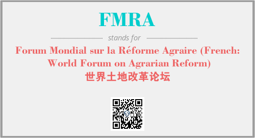 英文缩略词“FMRA”经常作为“Forum Mondial sur la Réforme Agraire (French: World Forum on Agrarian Reform)”的英文缩写来使用,中文表示:“世界土地改革论坛”。本文将详细介绍英文缩写词FMRA所代表英文单词,其对应的中文拼音、详细解释以及在英语中的流行度。此外,还有关于缩略词FMRA的分类、应用领域及相关应用示例等。