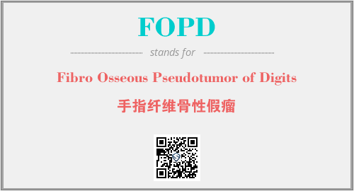 上述内容是“Fibro Osseous Pseudotumor of Digits”作为“FOPD”的缩写,解释为“手指纤维骨性假瘤”时的信息,以及英文缩略词FOPD所代表的英文单词,其对应的中文拼音、详细解释以及在英文中的流行度和相关分类、应用领域及应用示例等。