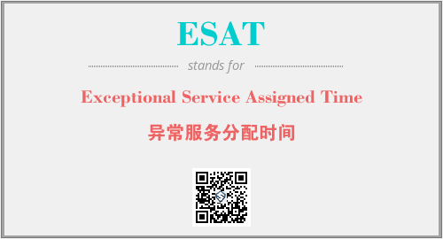 上述内容是“Exceptional Service Assigned Time”作为“ESAT”的缩写,解释为“异常服务分配时间”时的信息,以及英文缩略词ESAT所代表的英文单词,其对应的中文拼音、详细解释以及在英文中的流行度和相关分类、应用领域及应用示例等。