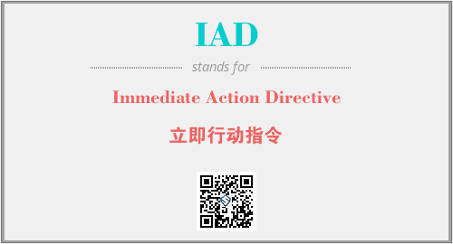 上述内容是“Immediate Action Directive”作为“IAD”的缩写,解释为“立即行动指令”时的信息,以及英文缩略词IAD所代表的英文单词,其对应的中文拼音、详细解释以及在英文中的流行度和相关分类、应用领域及应用示例等。