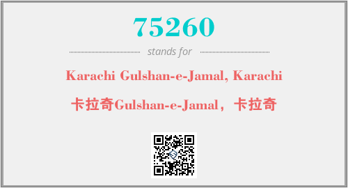 上述内容是“Karachi Gulshan-e-Jamal, Karachi”作为“75260”的缩写,解释为“卡拉奇Gulshan-e-Jamal,卡拉奇”时的信息,以及英文缩略词75260所代表的英文单词,其对应的中文拼音、详细解释以及在英文中的流行度和相关分类、应用领域及应用示例等。