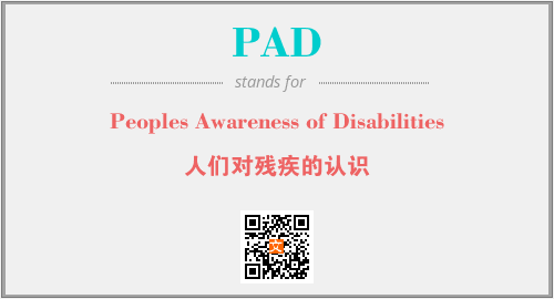 英文缩略词“PAD”经常作为“Peoples Awareness of Disabilities”的英文缩写来使用,中文表示:“人们对残疾的认识”。本文将详细介绍英文缩写词PAD所代表英文单词,其对应的中文拼音、详细解释以及在英语中的流行度。此外,还有关于缩略词PAD的分类、应用领域及相关应用示例等。
