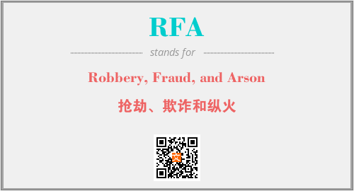 英文缩略词“RFA”经常作为“Robbery, Fraud, and Arson”的英文缩写来使用,中文表示:“抢劫、欺诈和纵火”。本文将详细介绍英文缩写词RFA所代表英文单词,其对应的中文拼音、详细解释以及在英语中的流行度。此外,还有关于缩略词RFA的分类、应用领域及相关应用示例等。