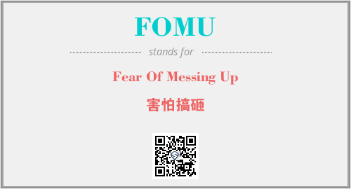 上述内容是“Fear Of Messing Up”作为“FOMU”的缩写,解释为“害怕搞砸”时的信息,以及英文缩略词FOMU所代表的英文单词,其对应的中文拼音、详细解释以及在英文中的流行度和相关分类、应用领域及应用示例等。