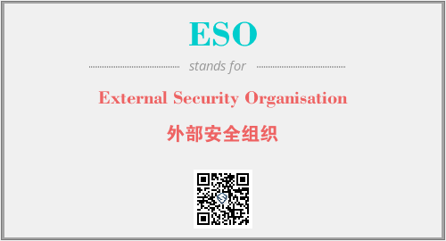 上述内容是“External Security Organisation”作为“ESO”的缩写,解释为“外部安全组织”时的信息,以及英文缩略词ESO所代表的英文单词,其对应的中文拼音、详细解释以及在英文中的流行度和相关分类、应用领域及应用示例等。