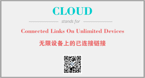 上述内容是“Connected Links On Unlimited Devices”作为“CLOUD”的缩写,解释为“无限设备上的已连接链接”时的信息,以及英文缩略词CLOUD所代表的英文单词,其对应的中文拼音、详细解释以及在英文中的流行度和相关分类、应用领域及应用示例等。