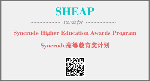上述内容是“Syncrude Higher Education Awards Program”作为“SHEAP”的缩写,解释为“Syncrude高等教育奖计划”时的信息,以及英文缩略词SHEAP所代表的英文单词,其对应的中文拼音、详细解释以及在英文中的流行度和相关分类、应用领域及应用示例等。