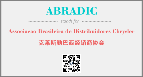 上述内容是“Associacao Brasileira de Distribuidores Chrysler”作为“ABRADIC”的缩写,解释为“克莱斯勒巴西经销商协会”时的信息,以及英文缩略词ABRADIC所代表的英文单词,其对应的中文拼音、详细解释以及在英文中的流行度和相关分类、应用领域及应用示例等。