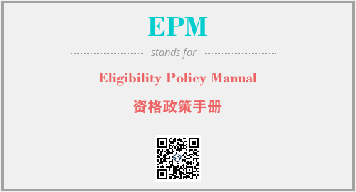 英文缩略词“EPM”经常作为“Eligibility Policy Manual”的英文缩写来使用,中文表示:“资格政策手册”。本文将详细介绍英文缩写词EPM所代表英文单词,其对应的中文拼音、详细解释以及在英语中的流行度。此外,还有关于缩略词EPM的分类、应用领域及相关应用示例等。