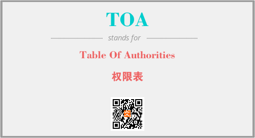 英文缩略词“TOA”经常作为“Table Of Authorities”的英文缩写来使用,中文表示:“权限表”。本文将详细介绍英文缩写词TOA所代表英文单词,其对应的中文拼音、详细解释以及在英语中的流行度。此外,还有关于缩略词TOA的分类、应用领域及相关应用示例等。
