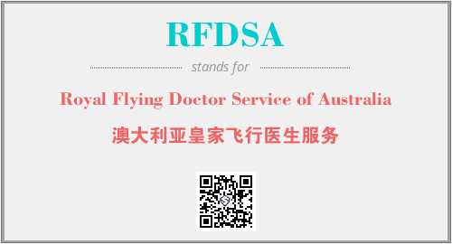 上述内容是“Royal Flying Doctor Service of Australia”作为“RFDSA”的缩写,解释为“澳大利亚皇家飞行医生服务”时的信息,以及英文缩略词RFDSA所代表的英文单词,其对应的中文拼音、详细解释以及在英文中的流行度和相关分类、应用领域及应用示例等。