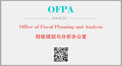 英文缩略词“OFPA”经常作为“Office of Fiscal Planning and Analysis”的英文缩写来使用,中文表示:“财政规划与分析办公室”。本文将详细介绍英文缩写词OFPA所代表英文单词,其对应的中文拼音、详细解释以及在英语中的流行度。此外,还有关于缩略词OFPA的分类、应用领域及相关应用示例等。