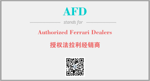 上述内容是“Authorized Ferrari Dealers”作为“AFD”的缩写,解释为“授权法拉利经销商”时的信息,以及英文缩略词AFD所代表的英文单词,其对应的中文拼音、详细解释以及在英文中的流行度和相关分类、应用领域及应用示例等。