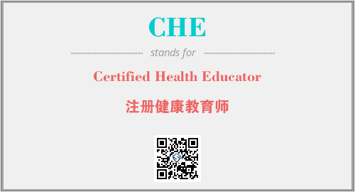 上述内容是“Certified Health Educator”作为“CHE”的缩写,解释为“注册健康教育师”时的信息,以及英文缩略词CHE所代表的英文单词,其对应的中文拼音、详细解释以及在英文中的流行度和相关分类、应用领域及应用示例等。